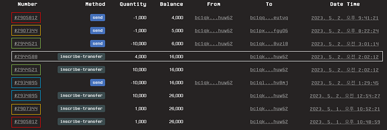 In order to transfer 26,000 XING tokens, bc1q…uw62 (Minter & Sender) inscribed the above text in 5 sats (Inscription #2905812, #2907344, #2934895, #2944521, #2944588) and sent the remaining 4 sats except Inscription #2944588 to another address to transfer 22,000 XING tokens.