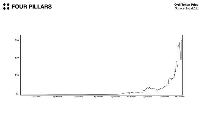 As BRC-20 tokens have gained traction, they have also seen their prices rise vertically. The individual price of ordi tokens, the first token in the BRC-20 standard, started at $0.1 per token and increased 310x to $31.0 on May 8, giving it a market capitalization of nearly $650M. A market capitalization of this magnitude would place it at around #70 on Coingecko, higher than Sui and Optimism.