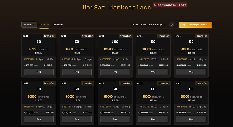How does trading in BRC-20 tokens work? The Ethereum network allows for smart contracts, which allows for trustless listing and purchasing on the marketplace protocol, but it is not possible to build such smart contracts on the Bitcoin network. However, if you go to the UniSat Marketplace, you can see all kinds of tokens listed, and buyers can connect their Bitcoin wallets to purchase them. In addition to the secondary trading of BRC-20 tokens, this is also seen on various marketplaces that sell image-inscribed Oridnals (e.g. MagicEden). Are all existing Ordinals marketplaces using a centralized custody method?