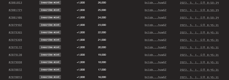 Then, bc1q…uw62 (Minter) inscribed the above text into 26 different sats, minting a total of 26,000 XING tokens as shown below. The reason why 26,000 tokens were issued over 26 sats, rather than all at once, is that the maximum issuance limit (lim) was limited to 1,000.