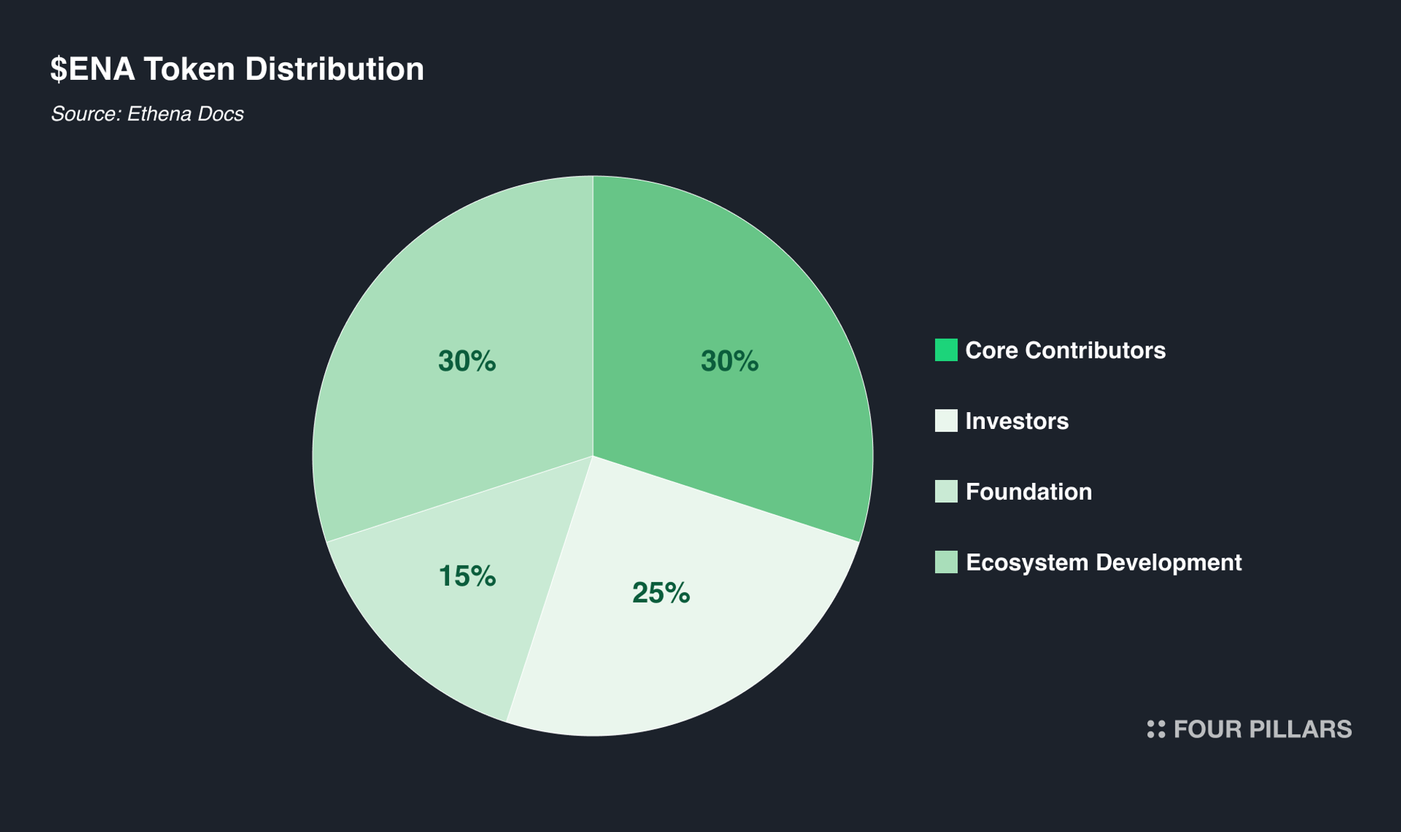 The tokenomics of ENA are structured to balance incentivizing contributors and maintaining an active ecosystem. Core contributors hold 30% of the token allocation, investors hold 25%, the Ethena Foundation holds 15%, and the remaining 30% is reserved for ecosystem development, including airdrops and funding for new projects.