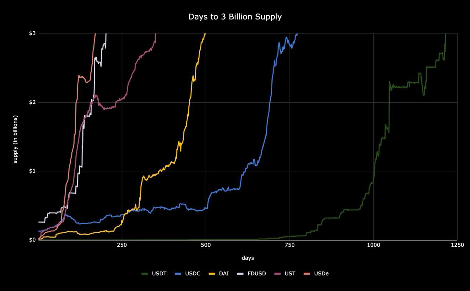 Market Cap: The market capitalization of USDe has surpassed $3 billion, making it the fastest-growing crypto dollar asset in crypto history.