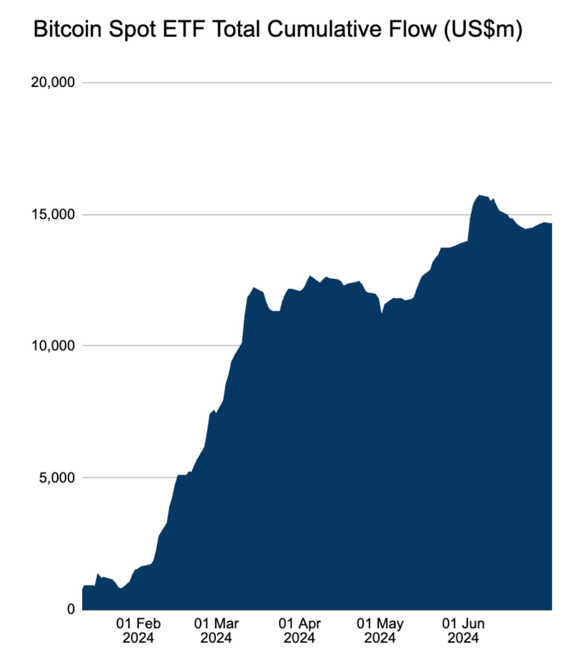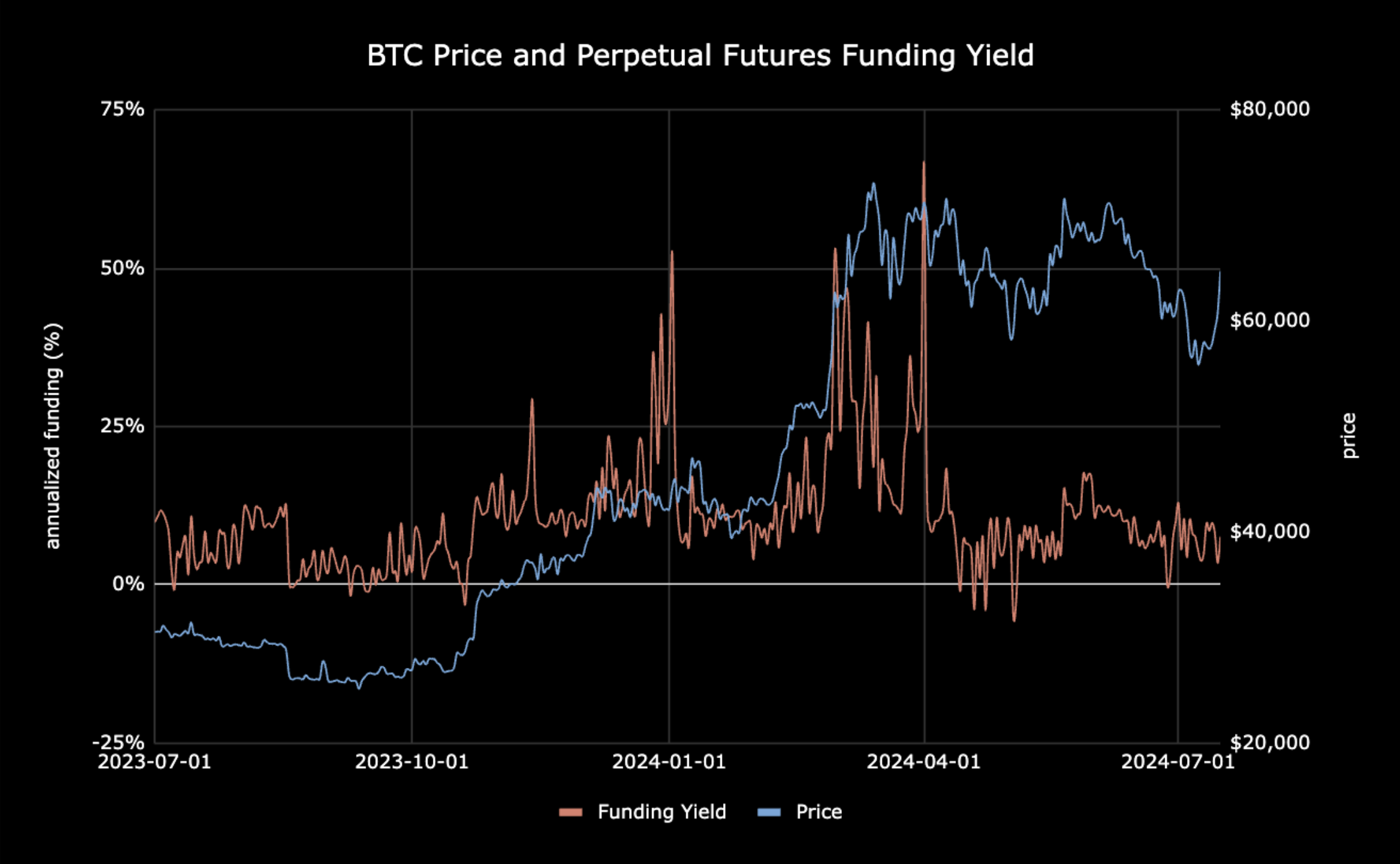 Also, the price of Bitcoin has also gone up since the approval. The chart illustrates the correlation between Bitcoin's price and the annualized funding yield for perpetual futures contracts from July 2023 to July 2024. The data shows a significant increase in both Bitcoin's price and funding rates following the ETF approval. The approval of the Bitcoin ETF by the U.S. SEC on January 10, 2024, led to a notable surge in Bitcoin's price, which climbed from around $40,000 to nearly $80,000 within a few months.