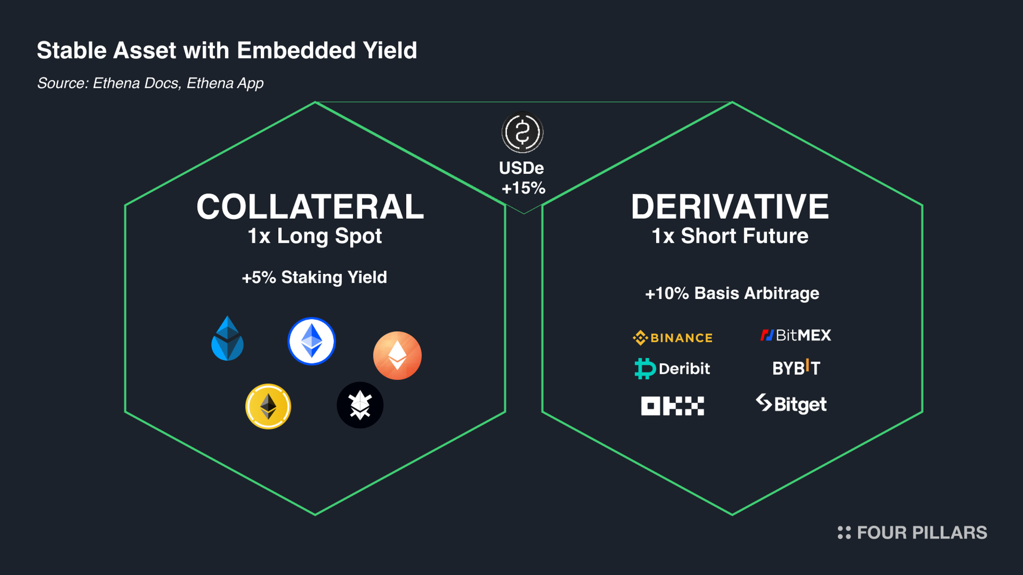 Ethena's USDe, a synthetic dollar token, emerged as a particularly attractive option after the Bitcoin ETF approval. By leveraging the increased market activity and higher funding rates, USDe was able to generate yields upwards of 30% post-ETF approval. This impressive return was achieved through a combination of strategies, including delta-hedging staked Ethereum collateral and capitalizing on the widened spread between spot and futures markets through its basis arbitrage. Let’s look into how it works, and why Ethereum ETF can effect this yields.