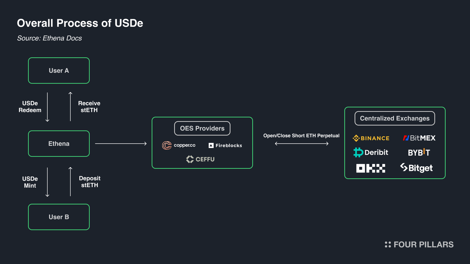 Ethena is also exposed to custody and smart contract risks. The protocol relies on external platforms, such as centralized exchanges and Off-Exchange Settlement (OES) providers, which introduces potential risks stemming from their operations or security breaches. If these platforms face insolvency or operational issues, it can impact Ethena's ability to execute trades and maintain its delta-neutral position. However, if a centralized exchange becomes insolvent, Ethena's perpetual position will close, but the collateral assets themselves should be safe as they were never in the exchanges to begin with.
