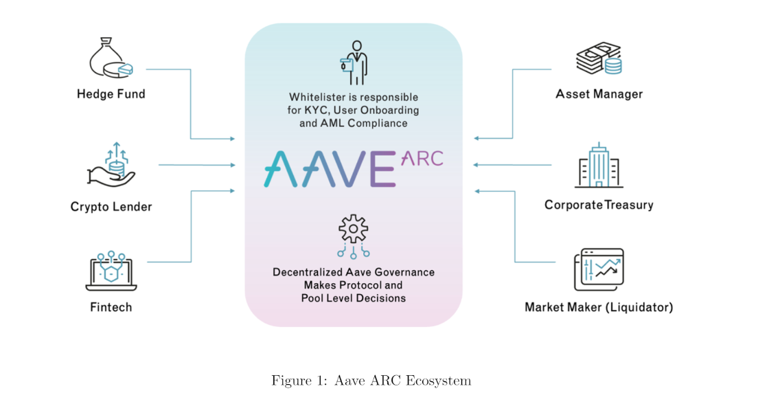 Aave Arc operates as a permissioned liquidity pool based on Aave V2, incorporating additional smart contracts for whitelisting users. Only those who have undergone KYC or KYB can interact with Aave Arc, with processes like KYC, AML, and CFT conducted by Aave Arc's whitelisters. Fireblocks was the first whitelister, granting whitelist access to 30 trading firms, including GSR, Celsius, and Wintermute.