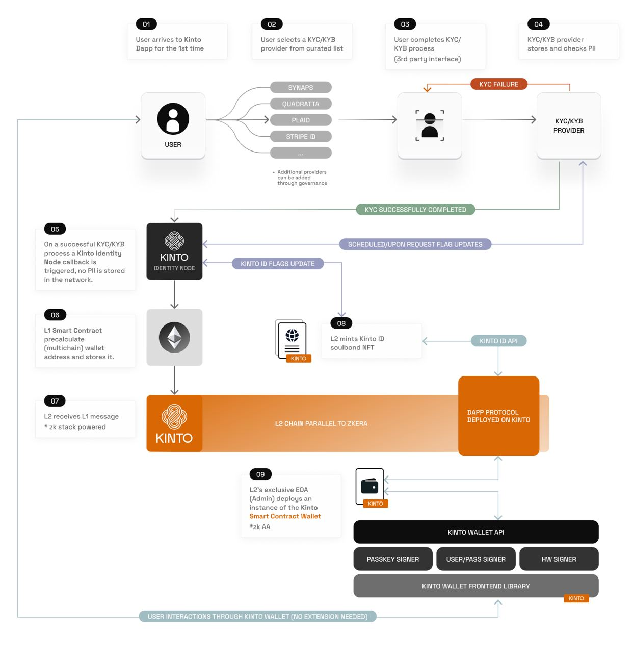 On the Kinto network, KYC verification is conducted by designated KYC Providers. These providers authenticate user identities and perform ongoing AML/PEP screenings. Users verified by KYC Providers receive a Kinto ID (a soulbound token) in their Kinto Wallet. Applications on Kinto are accessible only to users possessing a Kinto ID.