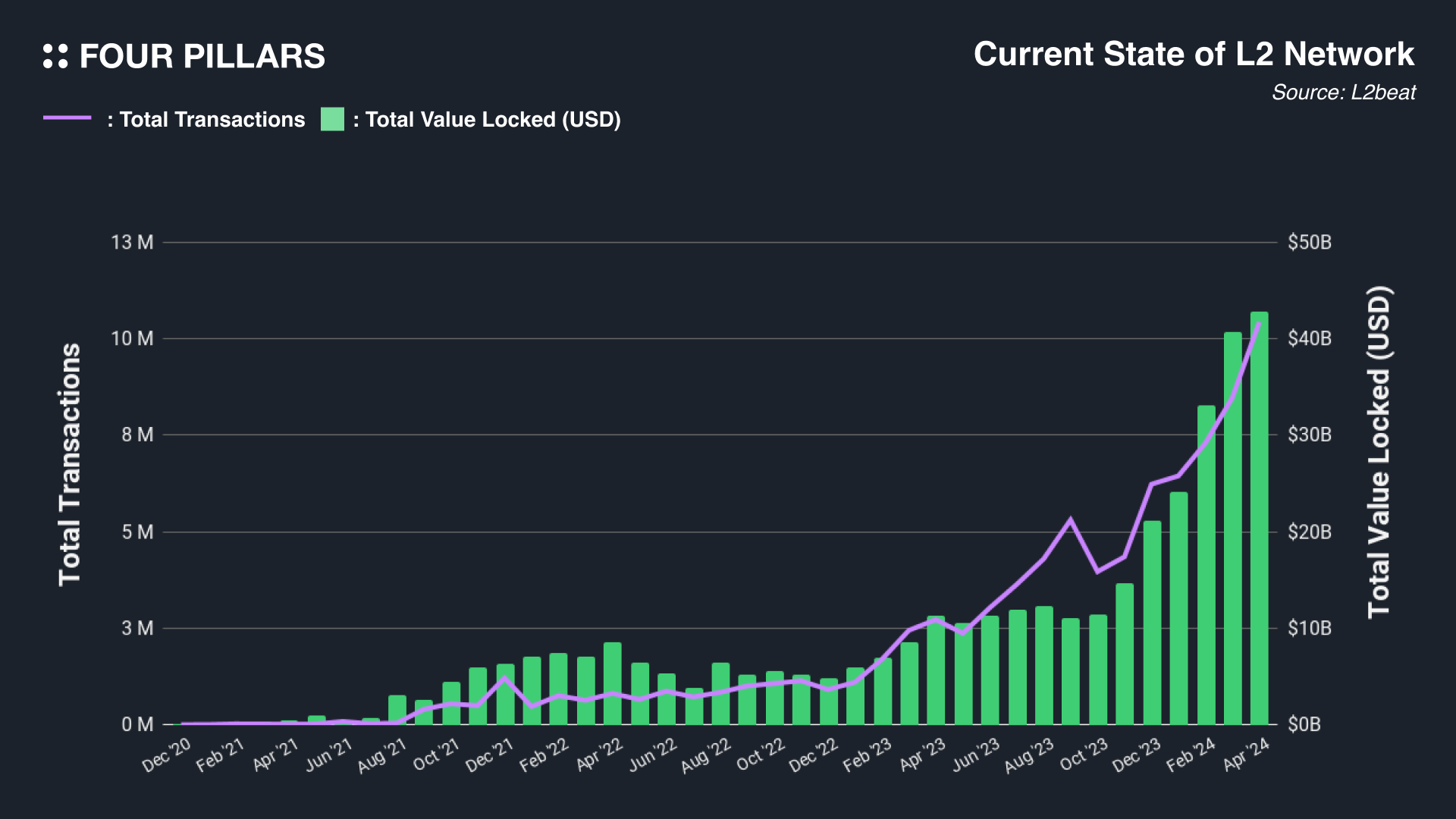 The "rollup-centric Ethereum roadmap" by Vitalik Buterin has been announced, drawing significant attention to the modular faction centered on Ethereum since 2023, particularly to rollup solutions. According to L2beat data, the total daily transactions occurring across all L2 networks maintain over ten million, which is ten times the number of transactions occurring on Ethereum. Currently, there are 47 projects operating on mainnet within the rollup solutions, and as of April 5, their Total Value Locked (TVL) totals $37.22 billion, indicating a large scale. Including 34 projects that are planned to be launched, the rollup ecosystem is expected to expand further.