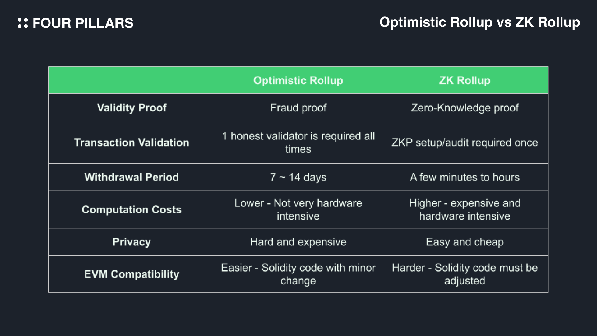 Optimistic Rollups operate under the assumption that off-chain computations are performed honestly. Therefore, a dispute period exists on-chain (i.e., on Ethereum) for the operations to be finalized, requiring users to wait for this period to withdraw assets. In contrast, Zero-Knowledge Rollups can provide instant finality through ZKP, allowing for relatively quick asset withdrawals. However, generating ZKP can be costly, so efforts are being made to reduce costs and time.