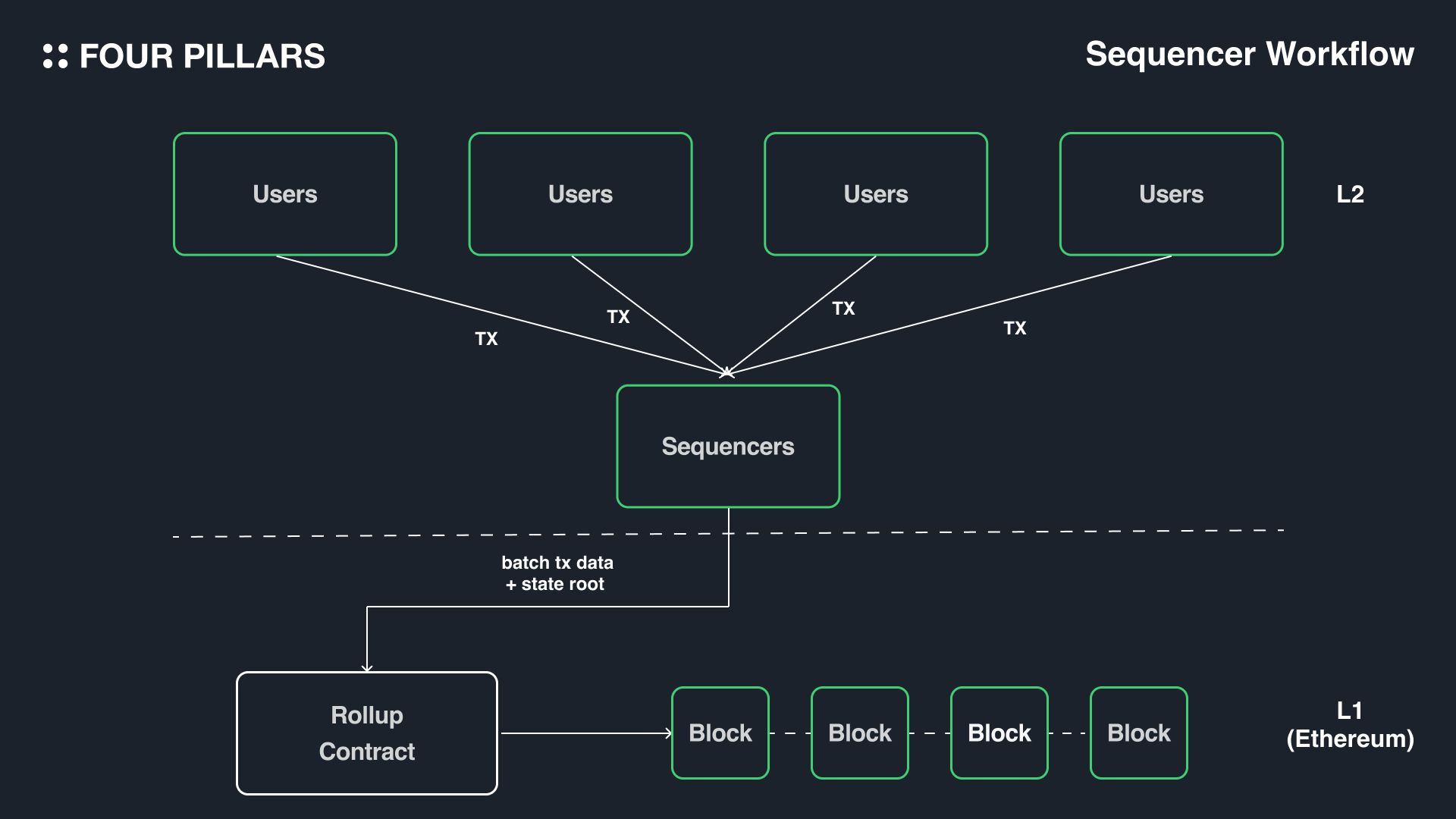 The sequencer plays a crucial role in the process where a rollup handles transactions and posts them on-chain. It receives transaction data from users on the L2 off-chain, batches, and compresses them before committing them to Ethereum. Protocols may have different definitions for sequencers, sometimes distinguishing between the entity that processes transactions and the one that submits them to Ethereum as "sequencers" and "proposers." However, most rollup systems currently have a single entity (i.e., the sequencer) performing both tasks.