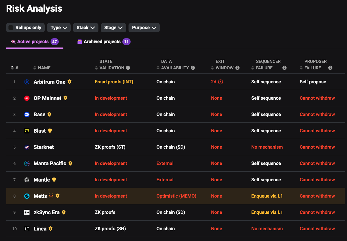 This table indicates the risk levels of various protocols, with yellow highlighting indicating some risk and red indicating ongoing development or reliance on the project. Currently, no rollup in the top 10 L2 protocols meets all five criteria of the framework.