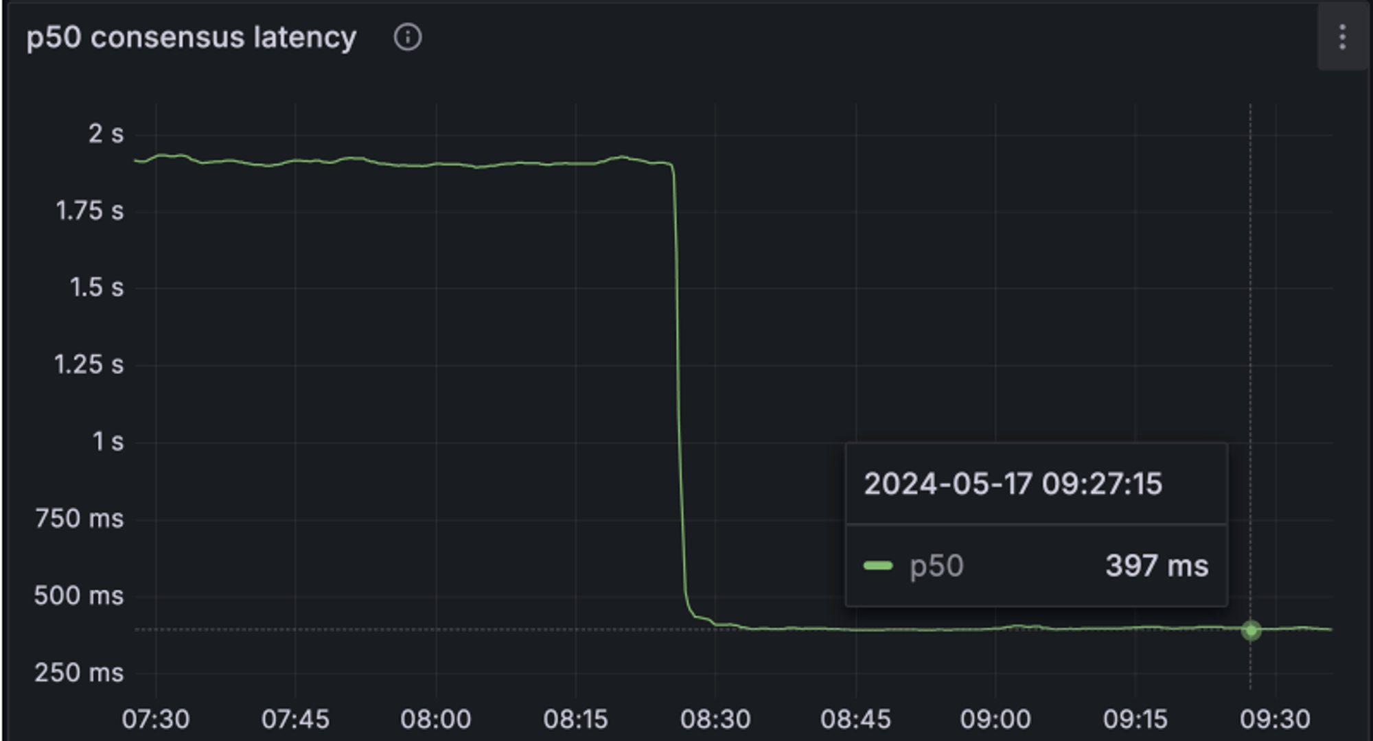 (The above graph shows the trend of changes in the median network latency due to the transition in consensus from Bullshark to Mysticeti. It is very impressive that while Bullshark resulted in approximately 2 seconds of latency, changing the consensus to Mysticeti reduced this to about 0.39 seconds.)