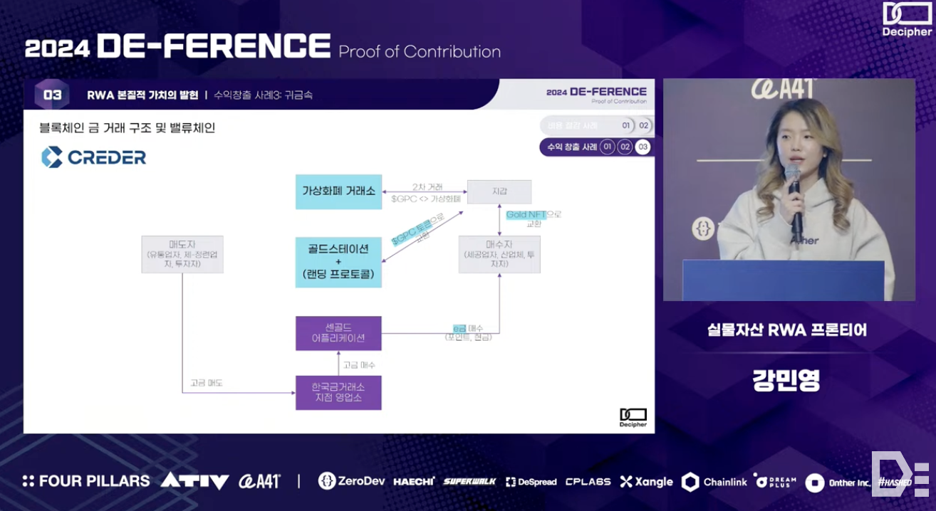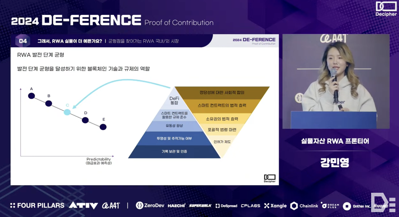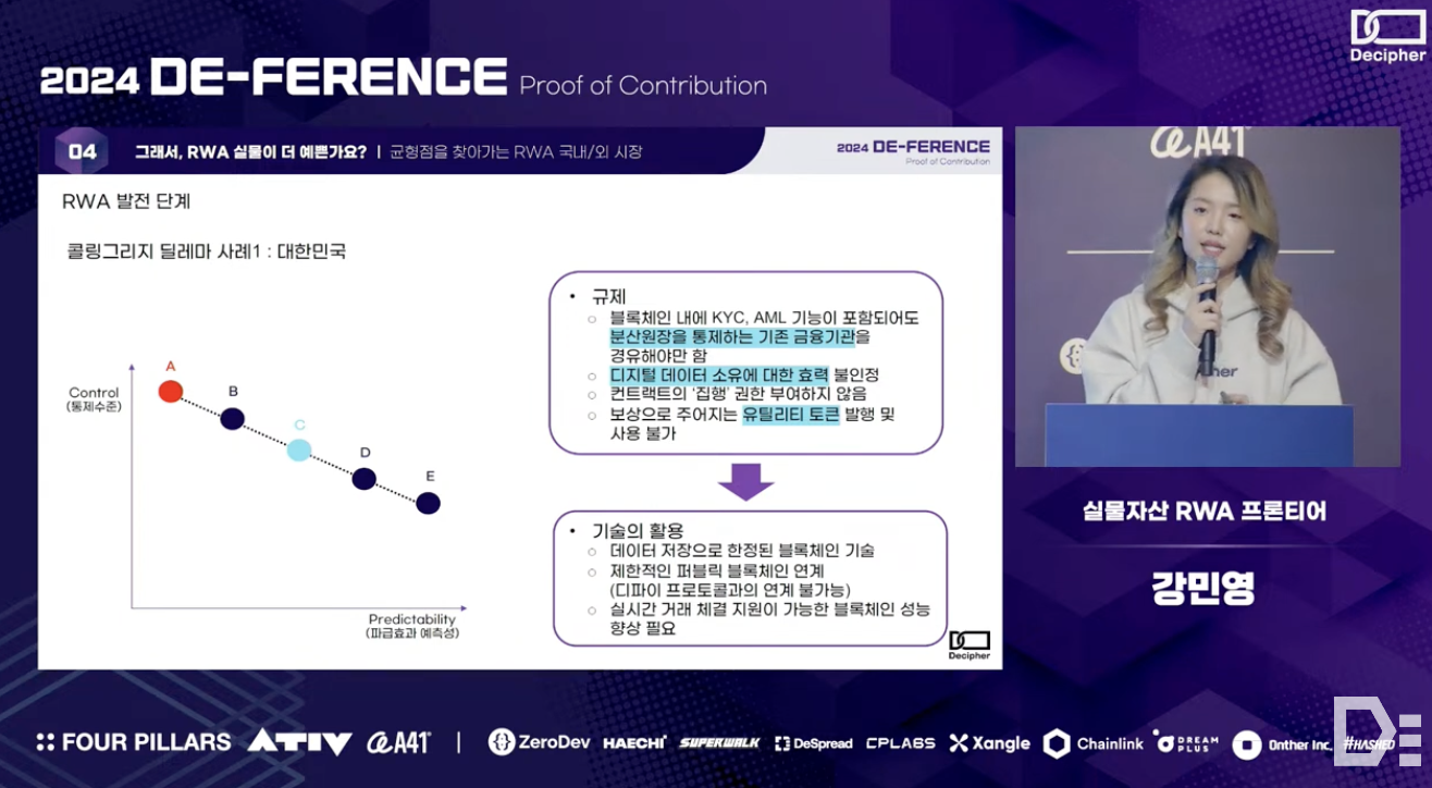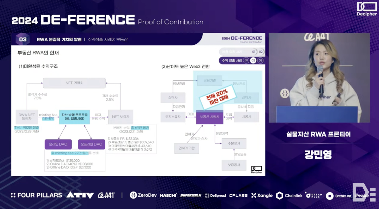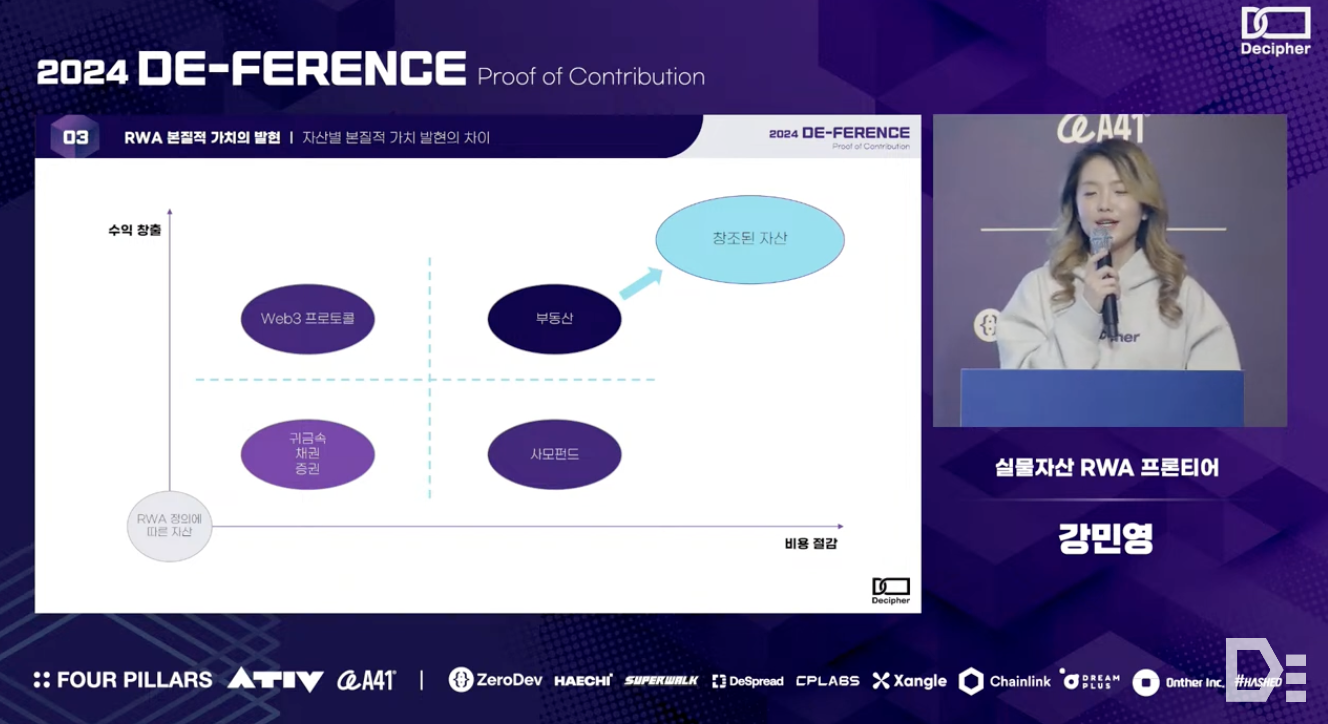 Minyoung Kang from the RWA Frontier team discussed the definition, rapid growth in market, and inherent value of the Real-World Asset (RWA) in her presentation. The team conducted interviews with various groups to clearly define RWA based on three criteria and analyzed the main revenue sources of RWA platforms, which are 'cost reduction' and 'additional revenue generation opportunity,' using real-world examples. Additionally, they compared regulatory environments across different countries to emphasize the importance of technical implementation and flexible regulations for the successful adoption of blockchain technology, and concluded the presentation by providing insights into how blockchain technology can be well integrated into the existing financial system.