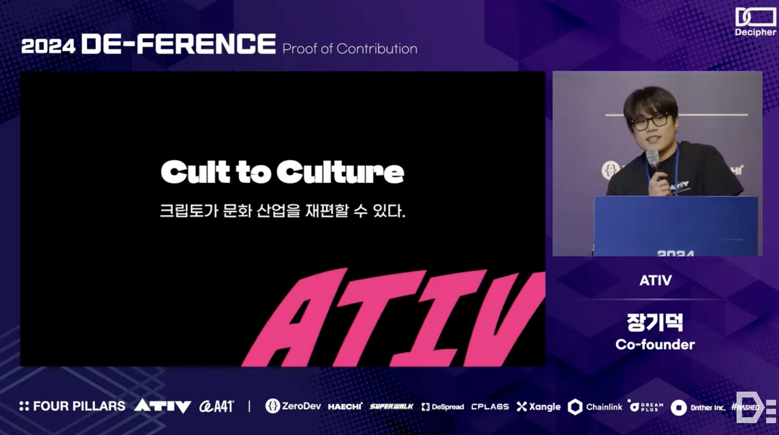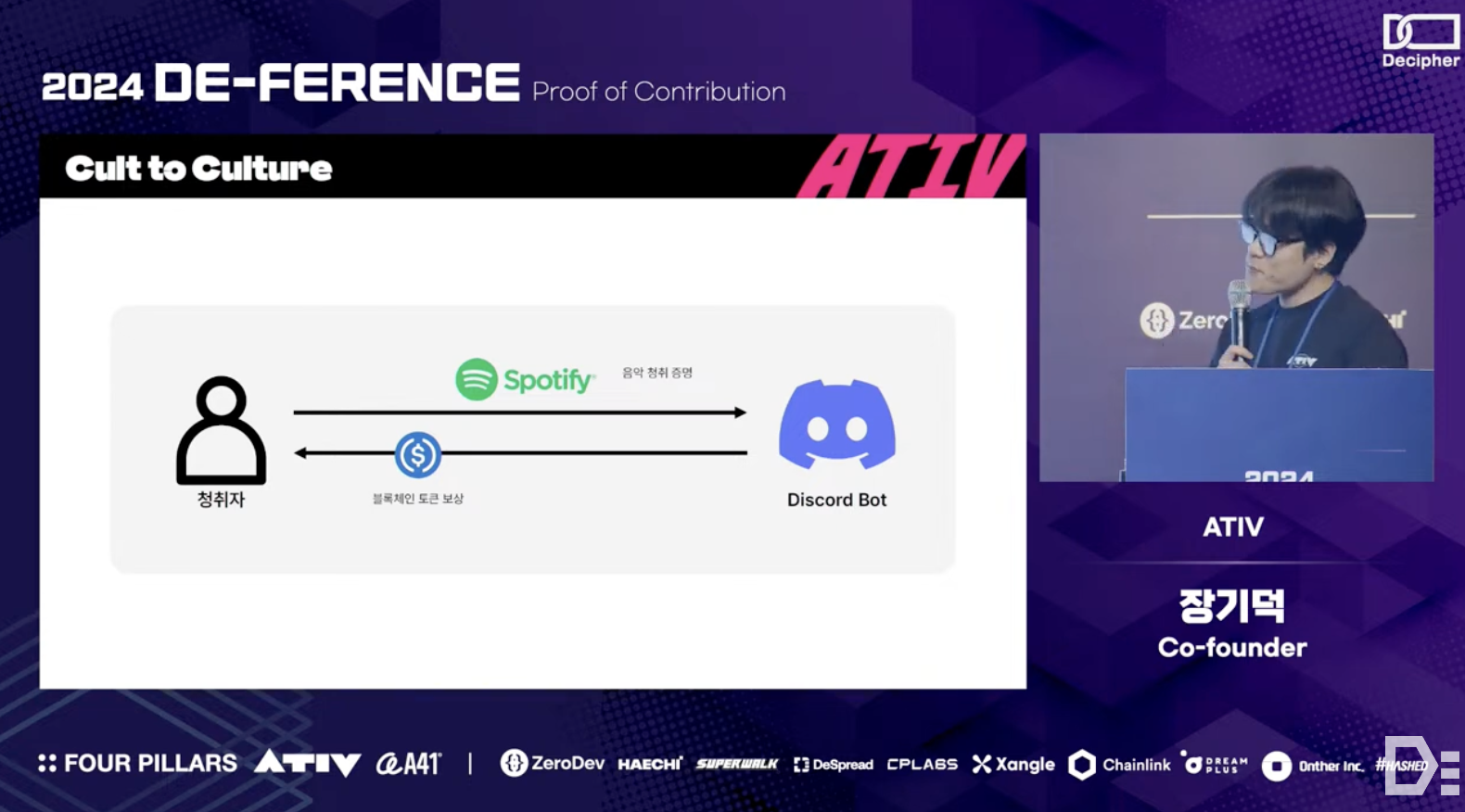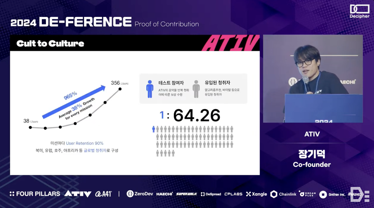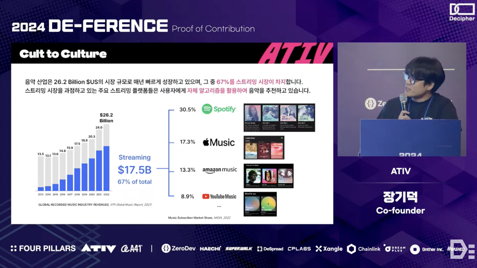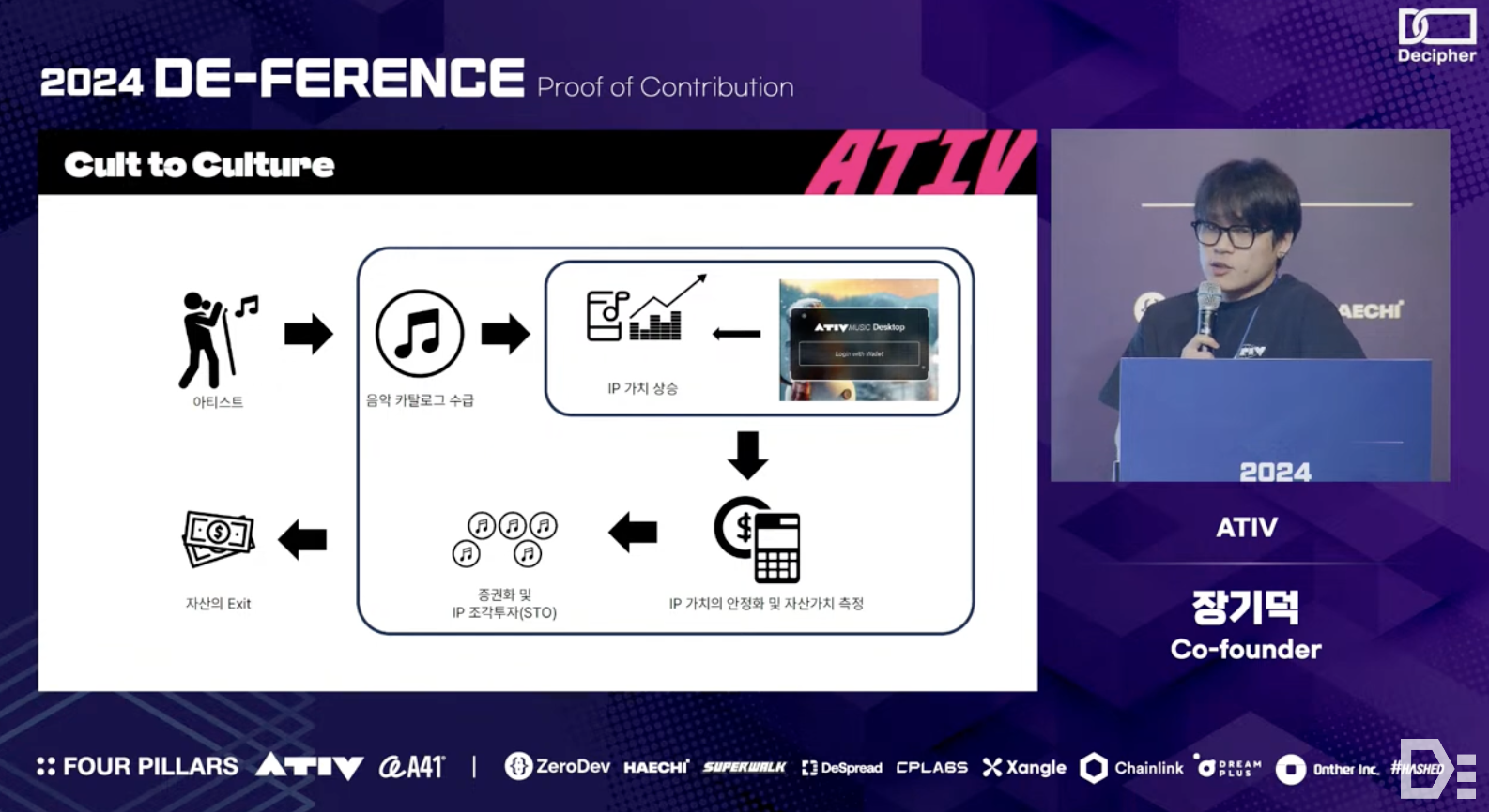 Gideok Jang from the ATIV team explained why understanding the cultural phenomena of crypto is essential from a product-building perspective. He shared the context and vision behind the formation of the ATIV team and their future goals. The ATIV team aims to reshape the music industry's culture through IP Acceleration, with three main objectives: first, to widely publicize the concept and value of neighboring rights through the $ATIV token; second, to make artists' IP easily accessible to the public and fairly evaluated; and third, to support the conversion of these evaluated IPs into revenue-generating assets for various financial activities.