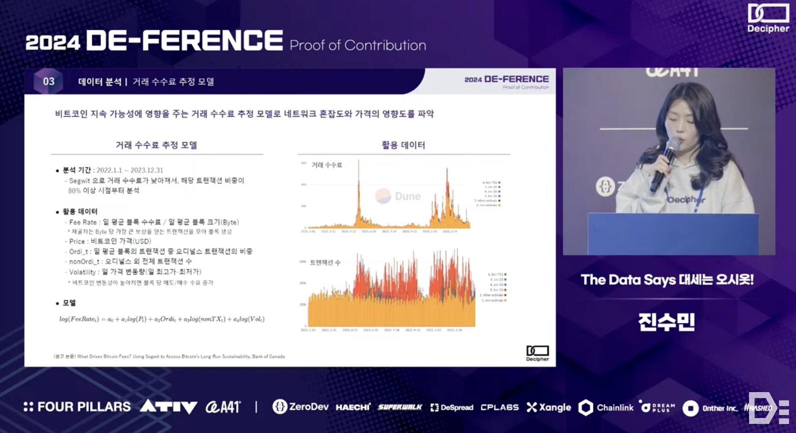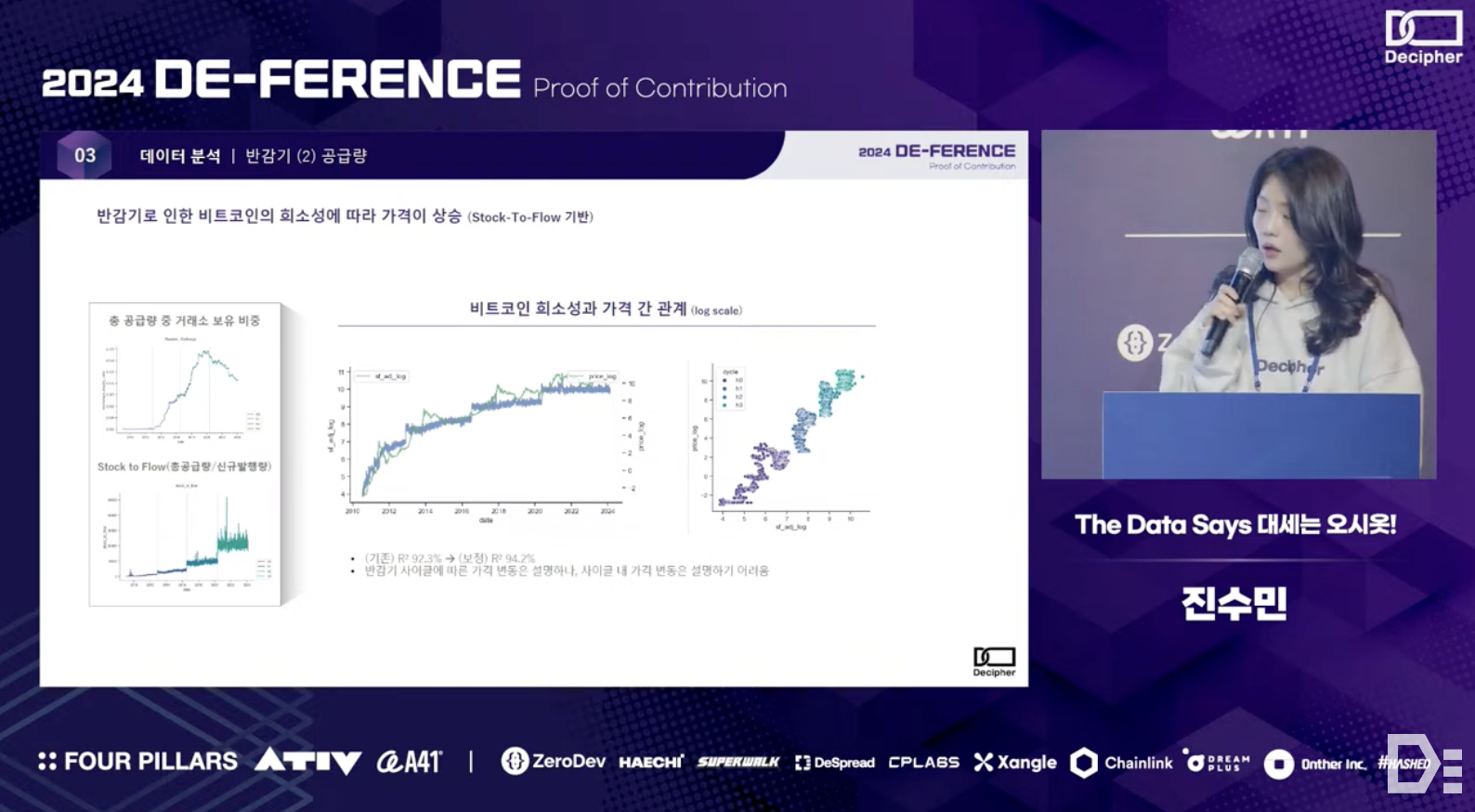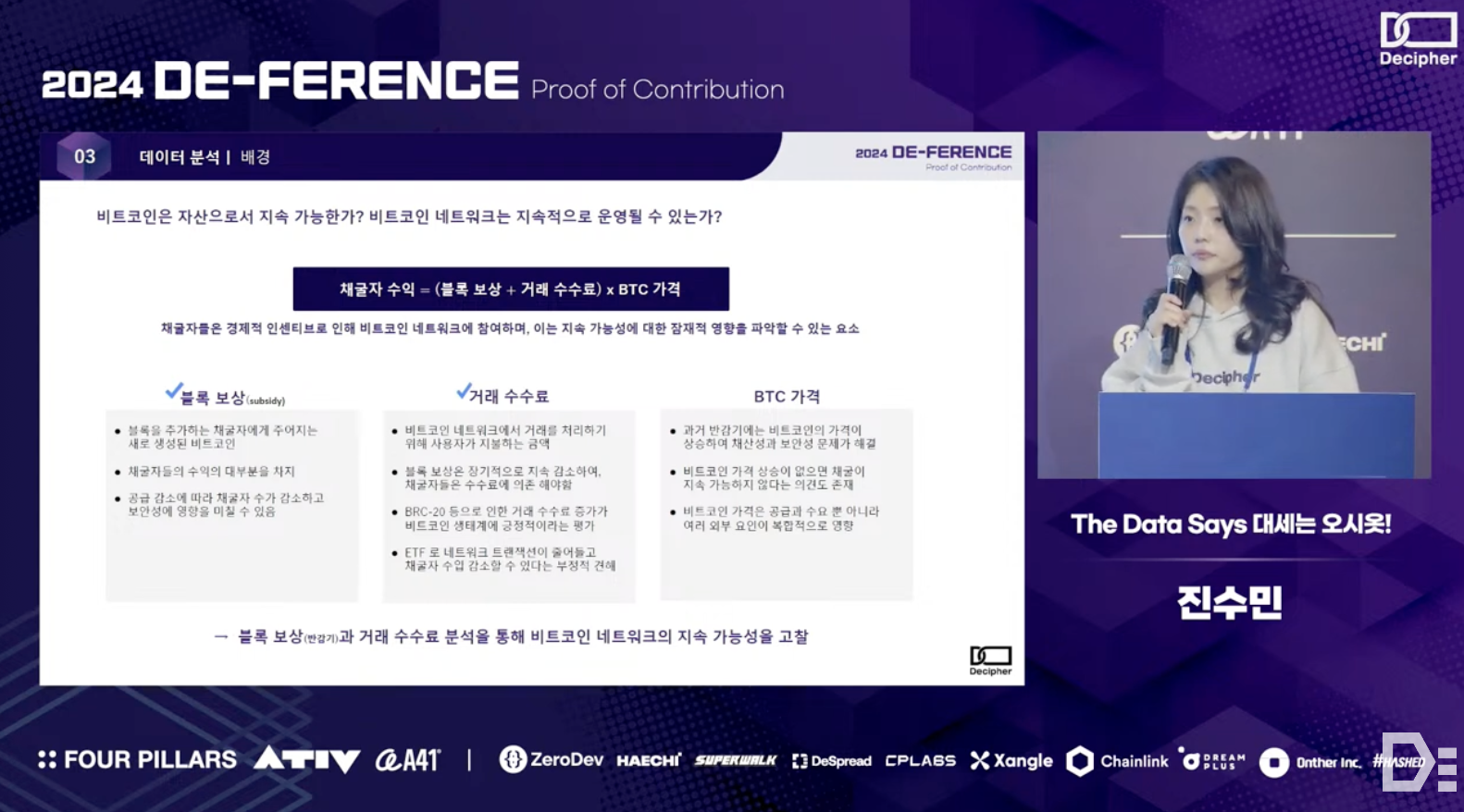 Sumin Jin from the O-siot team shared the results of an analysis that combined on-chain data with various off-chain data to explore the sustainability of Bitcoin, which is gaining attention as a digital asset or store of value. More specifically - the team observed patterns in Bitcoin's price, hash rate, and miner pool dynamics during past halving cycles. Through simulation modeling, they quantitatively revealed how transaction fees and Bitcoin prices need to be complementarily structured to maintain the network's sustainability at or above the current level.
