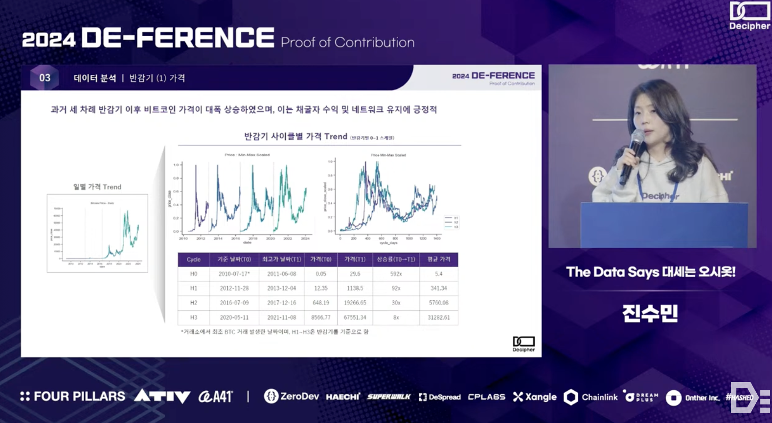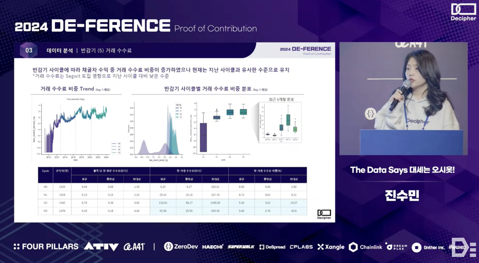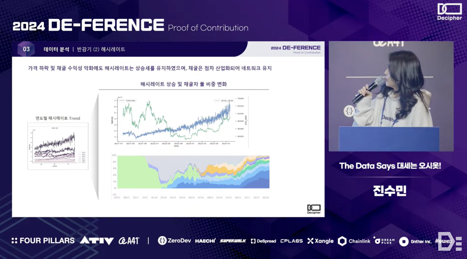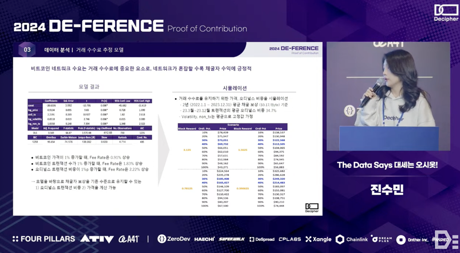 Sumin Jin from the O-siot team shared the results of an analysis that combined on-chain data with various off-chain data to explore the sustainability of Bitcoin, which is gaining attention as a digital asset or store of value. More specifically - the team observed patterns in Bitcoin's price, hash rate, and miner pool dynamics during past halving cycles. Through simulation modeling, they quantitatively revealed how transaction fees and Bitcoin prices need to be complementarily structured to maintain the network's sustainability at or above the current level.