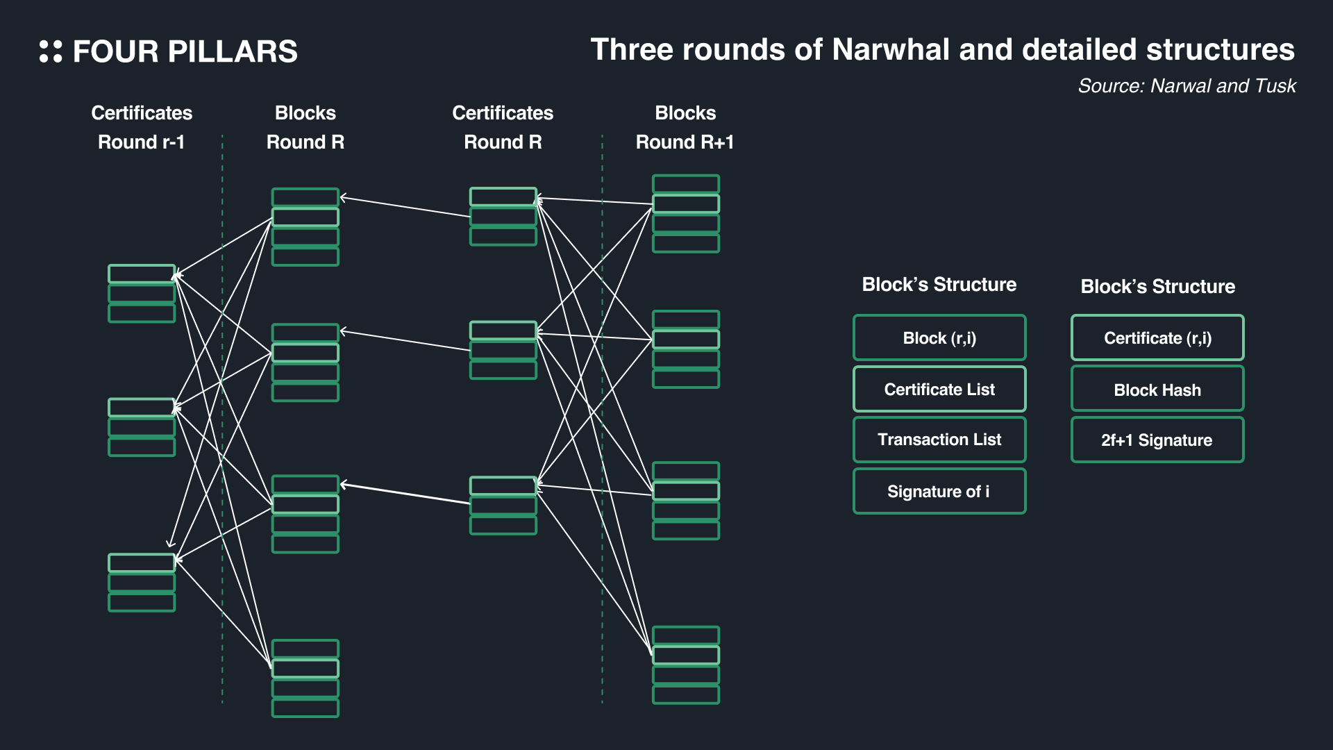 The blocks created in this manner are then transmitted to other validators through a leader validator, who also manages the process of the validators signing the block. If the signatures reach a quorum of 2f+1 (where f represents the maximum number of faulty or malicious nodes tolerated by the network), a certificate is issued. While Narwhal is separate from the consensus engine, it's important to note that the quorum standard depends on the consensus engine used with Narwhal. The leader then propagates this certificate to other validators, allowing them to include it in the next round's block. Once the leader verifies that 2f+1 validators have accumulated the certificate, they proceed to the next round. The block for the next round comprises information about the block producer, signatures, a list of transactions, and a list of certificates. The structure of the block indicates that the certificate list refers to certificates from previous rounds.