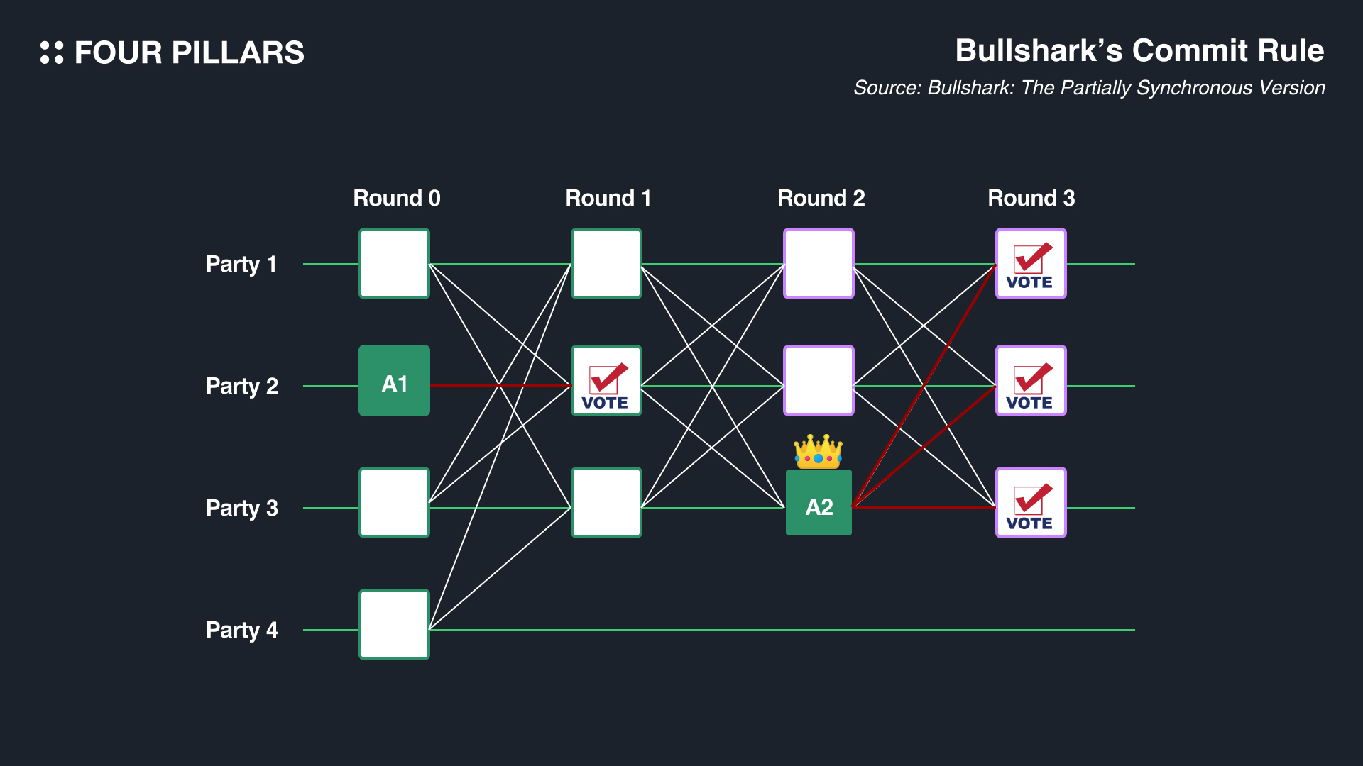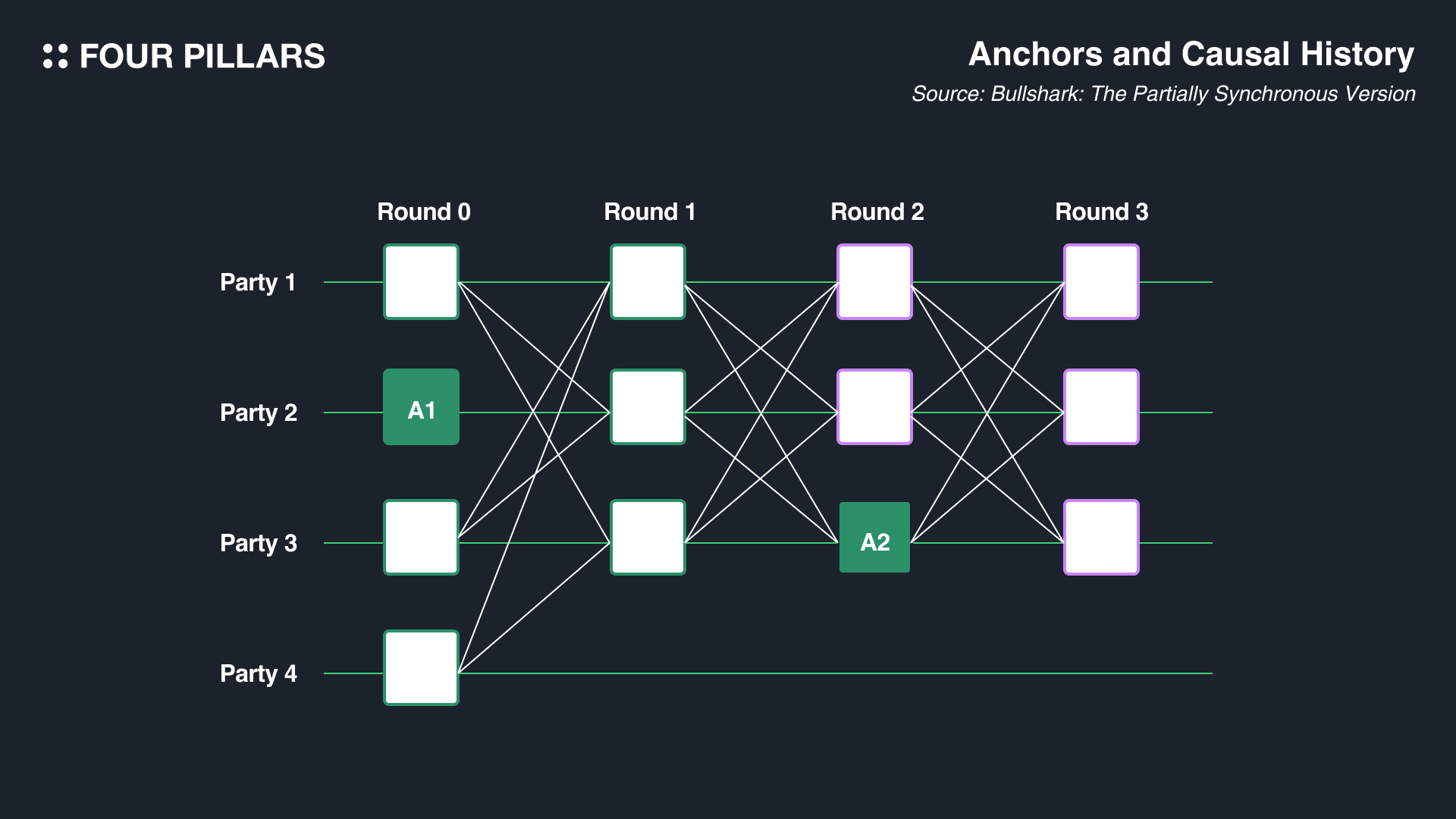 Bullshark is a round-based DAG BFT (Byzantine Fault Tolerant) consensus protocol. In this system, each vertex in the DAG corresponds to a round, and vertices called "anchors," which are owned by a leader, exist in every even-numbered round. During odd-numbered rounds, votes are cast for the anchors of the even-numbered rounds (thus, odd rounds involve anchors, and even rounds involve voting for these anchors). In the depicted structure, anchors are represented by vertices colored in green (A1 and A2), while the vertices with green borders represent those forming the causal order of the anchor (for example, the A2 anchor references vertices from party 1, party 2, party 3 in Round 1).
