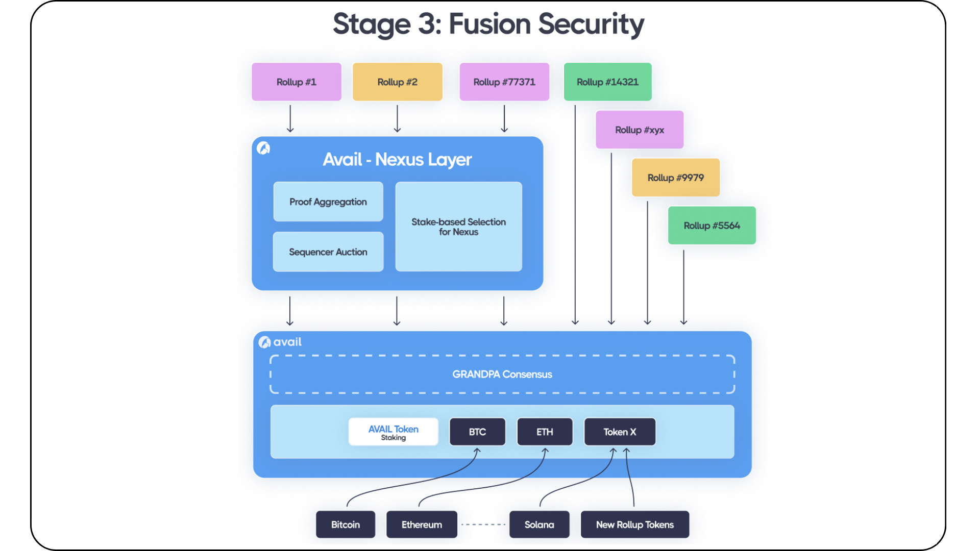 Avail Fusion은 롤업에 상속할 보안을 제공하는 통합 보안 레이어로 설계되었다. Fusion은 스테이킹할 수 있는 세 가지 유형의 토큰을 도입하는데, 바로 Avail의 네이티브 토큰, 롤업 토큰, 그리고 외부 토큰이다. BTC와 ETH와 같은 이미 성숙한 생태계의 네이티브 자산을 활용함으로써 Fusion의 보안은 크게 강화될 수 있다. 또한, Avail에서 구축된 새로운 롤업 토큰이 그 기반이 되는 레이어의 보안을 강화할 수 있다는 특징이 있다. 세부적인 구현은 암호경제적 보안 위험을 신중하게 고려해야 하겠지만, 외부 블록체인의 토큰을 활용하여 다른 블록체인의 보안을 강화하는 시도 자체가 혁신적이라고 할 수 있다.